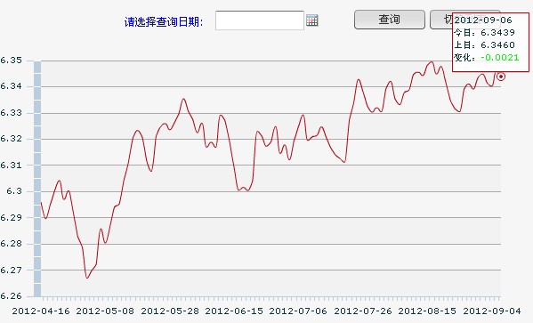 中國人民銀行授權中國外匯交易中心公布,2012年9月6日銀行間外匯市場人民幣匯率中間價為:1美元對人民幣6.3439元,1歐元對人民幣7.9936元,100日元對人民幣8.0864元,1港元對人民幣0.81786元,1英鎊對人民幣10.0881元,1澳大利亞元對人民幣6.4651元,1加拿大元對人民幣6.4022元,人民幣1元對0.49121林吉特,人民幣1元對5.0857俄羅斯盧布。