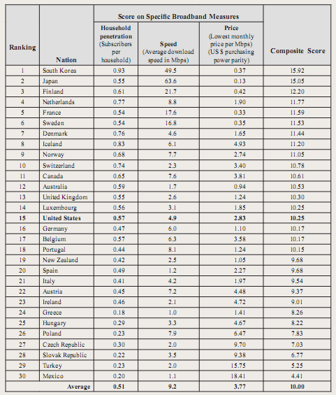 報告一共對比了普及率,網速,價格,綜合三者給出了最終得分。從全球范圍來看,寬帶普及率前五位分別為韓國(93%),冰島(83%),荷蘭(77%),丹麥(76%),瑞士(74%)。網速最快是日本,其次是韓國,超過10mbs的還有芬蘭,法國,瑞典。美國寬帶普及率為57%,網速為4.9mbs。在價格方面,最便宜的國家是日本(mbs/月僅0.13美元),收費最高的是墨西哥(mbs/月達到18.41美元)。