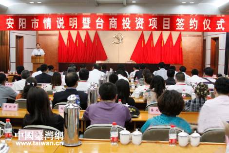 簽約儀式上,鄭州市委副書記、市長馬林青作了安陽市市情介紹。他說,近年來,安陽市深入貫徹落實科學發展觀,緊緊圍繞建設中原經濟區區域性中心強市奮斗目標,按照“富民強市、晉位爭先”的總體要求,大力實施項目帶動、新型城鎮化引領、文化旅游發展和黨建統領“四大戰略”,積極探索“三化”協調科學發展的路子,經濟社會發展保持了好的趨勢、好的態勢、好的氣勢。馬林青說,安陽與臺灣有著深厚的淵源,與臺商的合作由來已久,越來越多的臺商把目光投向安陽。熱忱歡迎更多的臺商朋友來安陽考察洽談、觀光旅游、投資興業。