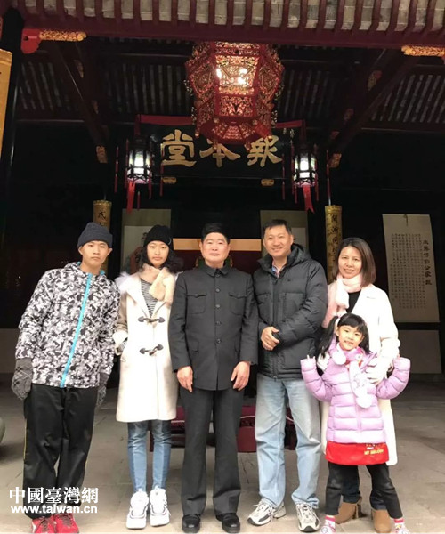 莊初文(左四)一家與莊德章(左三)在莊家祠堂正堂前的合影。(圖片來源:浙江省臺辦)