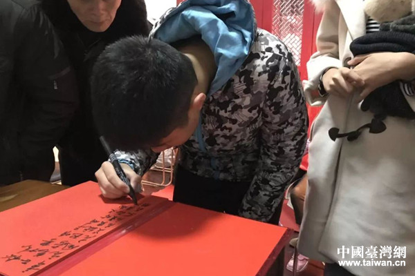莊初文的孩子在宗祠記錄本上簽名。(圖片來源:浙江省臺辦)