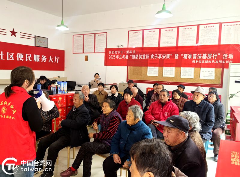 中國臺灣網10月20日訊 流年不棄桑榆老,秋光冉冉映重陽。為大力弘揚孝親敬老傳統美德,在重陽佳節到來之際,開封市蘭考縣委統戰部聯合桐鄉街道在人民社區開展“銀鈴賀重陽 歡樂享安康”暨“精準普法基層行”活動,邀請轄區內臺胞臺屬及60歲以上老人共聚一堂,歡度重陽佳節,為老人們送上了“暖心一樂”的專屬節日祝福和“接地氣”的“普法套餐”。