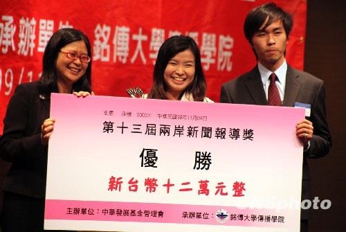 11月4日,由臺灣中華發展基金會主辦的第十三屆兩岸新聞報道獎在臺北舉行頒獎典禮,臺灣“陸委會”主委賴幸媛為獲得電視新聞報道獎的客家電視臺記者林秋伶、徐榮俊頒獎。今年評選活動共有十類、二十八件新聞作品入圍,分別從傳播、新聞、政法、經濟及兩岸關系等多方面、多角度地進行了深入報道,呈現出全面展開且更為深入的良性趨勢。承辦方、銘傳大學傳播學院院長陳耀竹表示,希望藉由該活動讓兩岸互相了解傳播現狀,減少認知上的差異。中新社發 李佳佳 攝