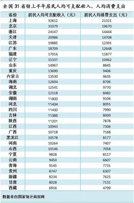 近日,國家統計局公布了31個省份2018年上半年居民人均可支配收入。數據顯示,上海、北京上半年居民人均可支配收入已超過3萬元,浙江、天津超過了兩萬元,其中上海以32612元居全國首位。