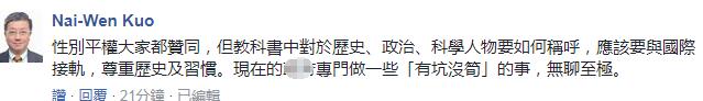 還有批評臺“教育部”根本就是“唯我獨尊的霸權心態”、“不尊重歷史文化,卻還奢談‘性別尊重’?”;