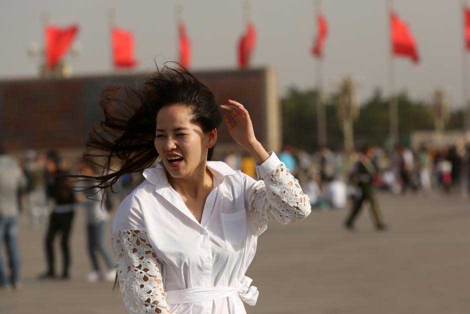5月3日,天安門廣場上,一名女游客的長發被風吹亂。當天,北京市氣象臺發布大風藍色預警,預計當日下午到夜間,北京市大部分地區將出現6級以上大風,陣風7-8級。中新社發 李慧思 攝