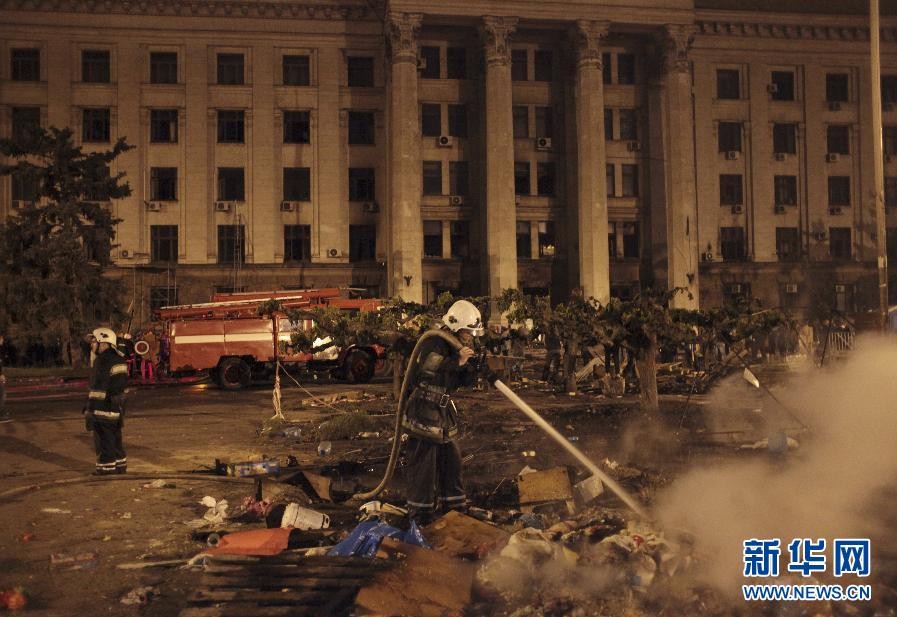圖為5月2日,消防隊員在烏克蘭敖德薩市內遭火燒的工會大樓前滅火。烏克蘭南部黑海沿岸城市敖德薩2日發生親政府與反政府兩派民眾沖突,導致43人死亡。 新華社/美聯
