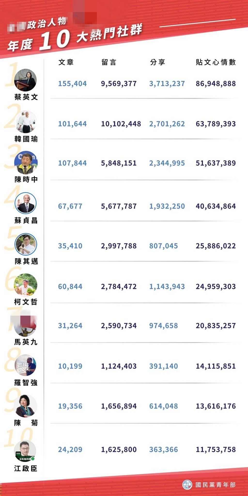 國民黨青年部主任陳冠安說,臉譜網是臺灣最主要的政治攻防網絡戰場,他以文章、留言、分享、貼文心情數做大數據分析,全臺12強依次是蔡英文、韓國瑜、陳時中、蘇貞昌、陳其邁、柯文哲、馬英九、羅智強、陳菊、江啟臣、侯友宜及賴清德。