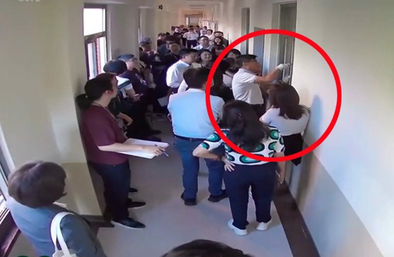 民進黨民代戴手套用工具破壞會議室窗戶。(圖片來源:臺灣“中時新聞網”)