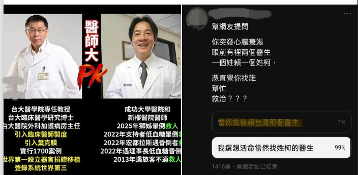也有網友粉絲專頁放出“柯、賴醫師大PK”對照圖,左邊是柯文哲的豐富醫界經歷,右邊則是賴清德的醫師簡歷,網友直呼:沒比較沒傷害。