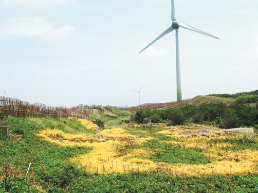 菟絲子(黃色藤蔓)攻占臺灣新竹縣海岸,將馬鞍藤當寄主并覆蓋其上,綠色定沙植物馬鞍藤不保。 臺灣《聯合報》圖
