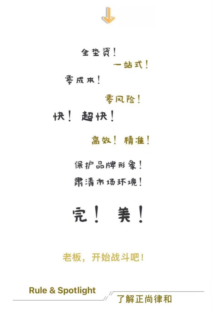 正尚律和的微信公號“正尚律和知識產權”中有一篇《正尚律和是怎么幫企業打假的?》文章,道出了正尚律和的運作模式:文章宣稱委托方不用花一分錢,也不用出一個人!罢新珊腿珖46個城市、32家律所的調查團隊、專業律師就都是你的人”,文章還稱2000+員工全國范圍內地毯式排查,用時15到45天,《全國侵權報告》出爐,“你說打誰我們就打誰”,用時30天左右“民事訴訟or協商解決or行政查處or刑事追究,你說了算”。文章還稱,整個過程全墊資,委托方零成本。