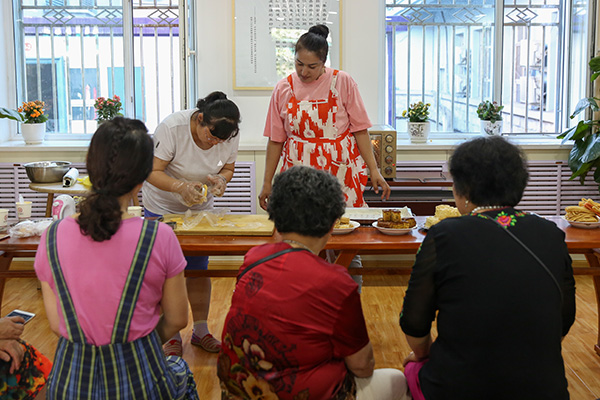 6月17日,澎湃新聞記者在海濱社區黨群活動中心參觀時,轄區居民阿那古麗·斯看代爾正在教社區居民烘焙糕點。