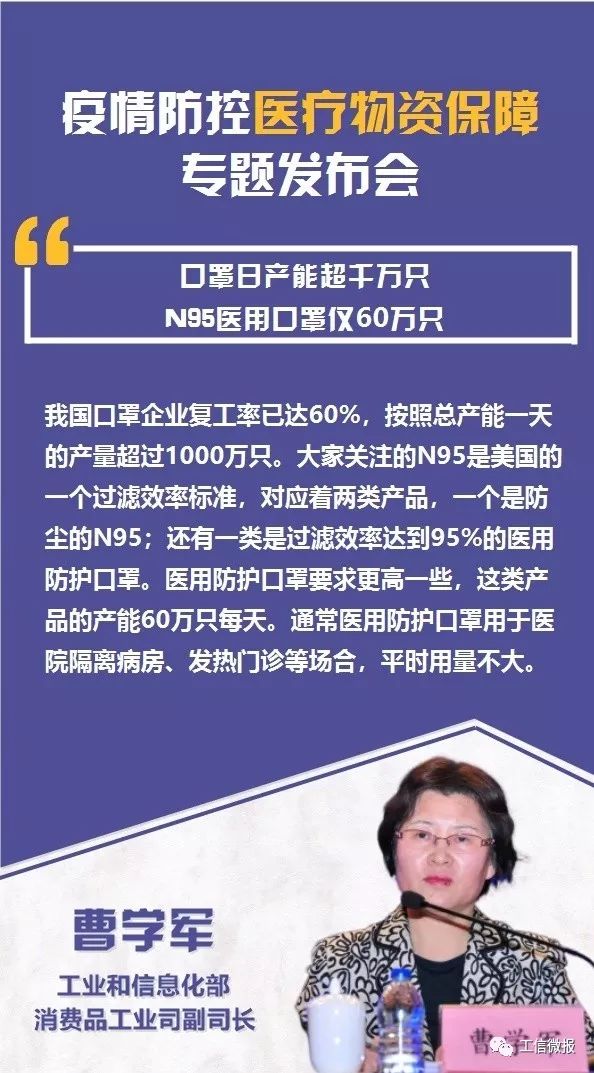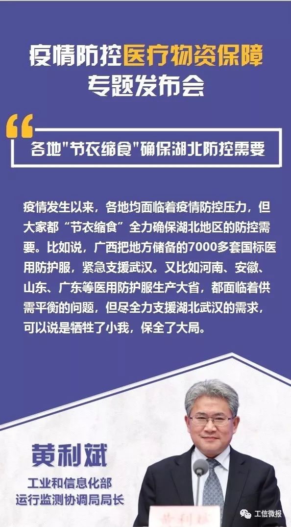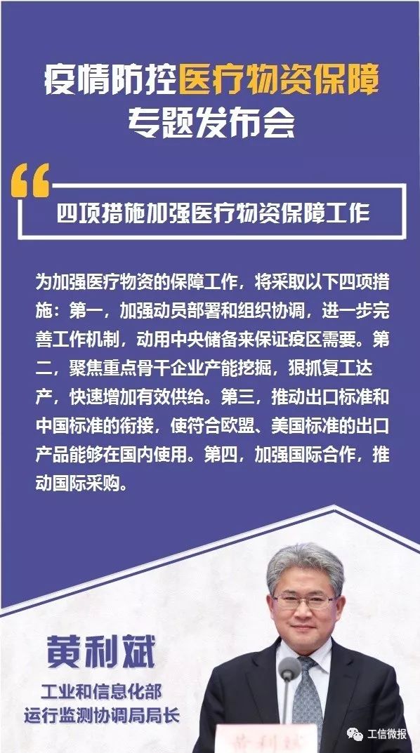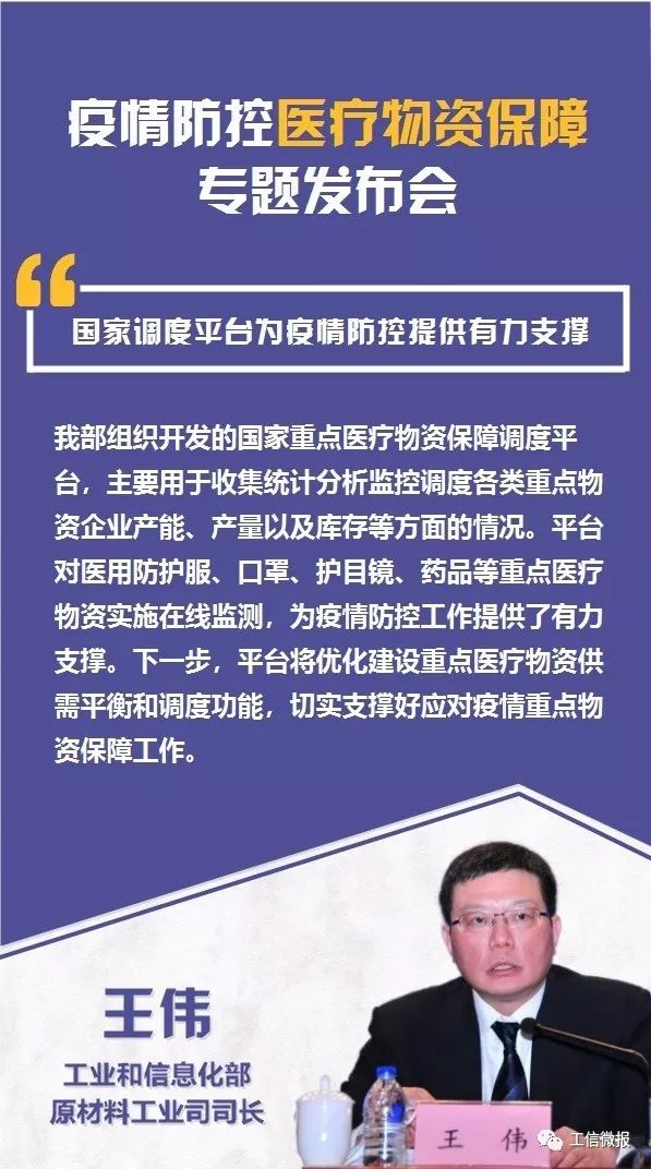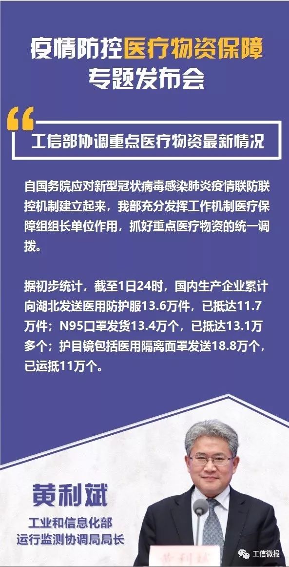 工業和信息化部今日舉行疫情防控醫療物資保障專題新聞發布會,工業和信息化部新聞發言人、運行監測協調局局長黃利斌,原材料工業司司長王偉,消費品工業司副司長曹學軍出席發布會,介紹新型冠狀病毒感染的肺炎疫情防控醫療物資保障情況,并回答了記者提問。當前醫療物資保障情況如何?如何進一步加強醫療物資保障工作?戳下圖速讀↓