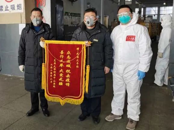 2月18日上午9時,武昌站行包車間收到來自上海復旦大學附屬中山醫院援鄂醫療隊的一面錦旗!斑@已經是武昌站第6次為我們提供鐵路運輸保障服務了,我代表援漢醫療隊所有成員向車站的努力表示感謝! 該院援鄂醫療隊成員薛淵說。