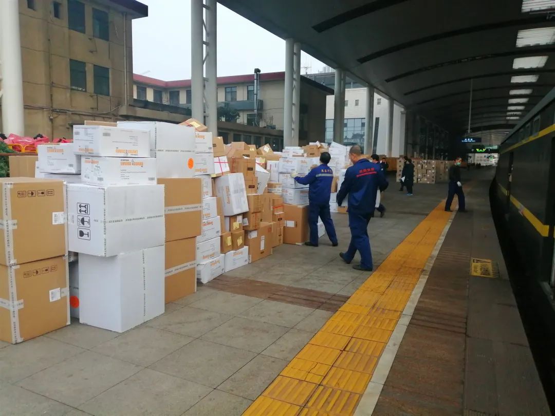 2月4日8時05分,由上海南開往成都方向的K354次列車?课洳1站臺,行李車上裝有15.2噸消毒液、抗生素等援漢防疫物資。