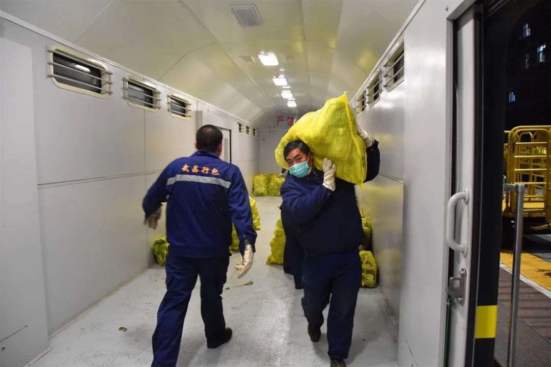 “1!2!3!”裝卸工的號子聲,在深夜空曠的站臺上回響。這是疫情期間武昌站司空見慣的場景。