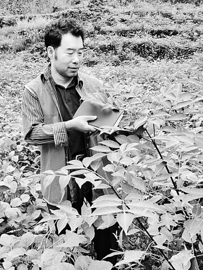 莊寧斌在查看開始掛果的吳茱萸。譚秀輝攝/光明圖片