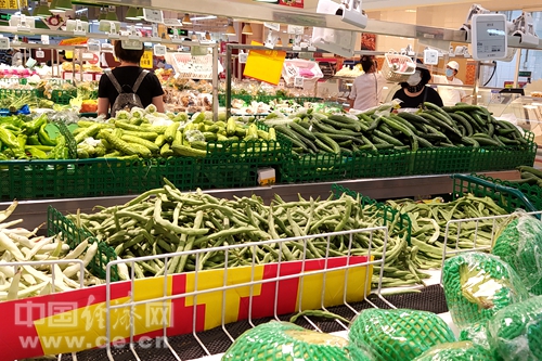 今日,經濟日報-中國經濟網記者對位于北京南三環某連鎖超市進行了走訪。在生鮮區的水果銷售區,包括櫻桃、西瓜、藍莓、荔枝、山竹等各類時令水果整齊排列供人挑選,個別水果還有優惠活動。同在該超市的蔬菜區,盡管過了上午買菜的高峰時段,但仍有消費者在挑選蔬菜,除個別特價商品銷售見底外,大部分蔬菜供應充足,并有吃過午飯的理貨員在整理菜架,準備補貨。