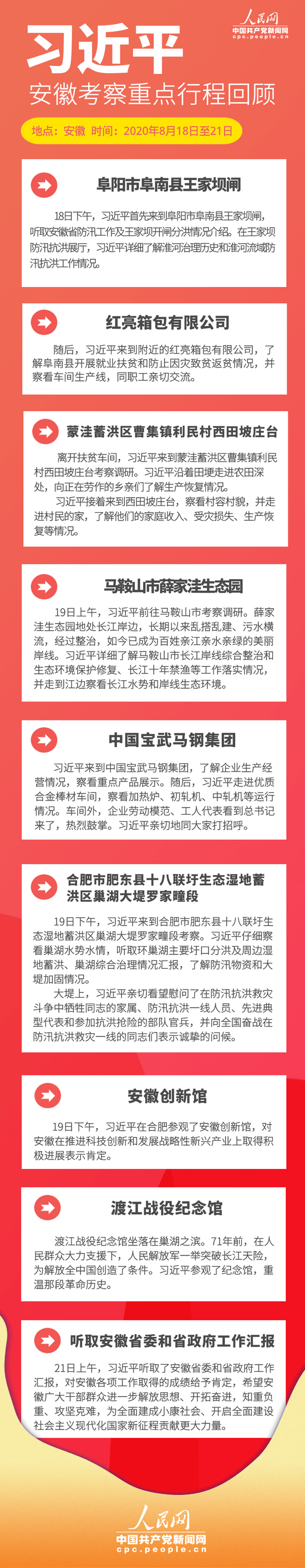 8月18日至21日,習近平來到安徽,看望慰問受災群眾和防汛救災一線人員,就統籌推進常態化疫情防控和經濟社會發展工作、加強防汛救災和災后恢復重建、推進長三角一體化發展、謀劃“十四五”時期經濟社會發展進行調研。