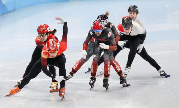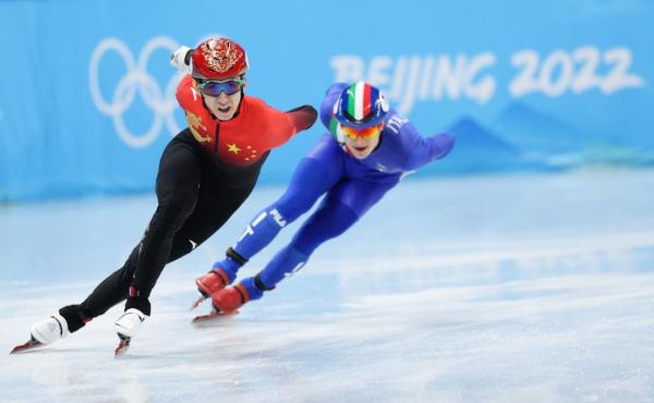 2月5日,中國隊選手任子威(左二)與隊友曲春雨(左一)在北京2022年冬奧會短道速滑項目混合團體接力四分之一決賽中。新華社記者蘭紅光攝