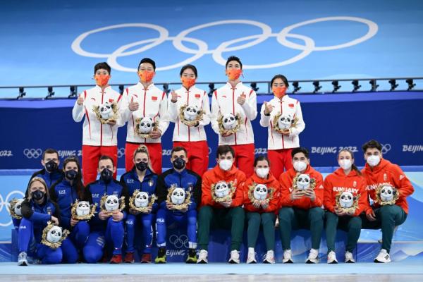 在賽后頒發紀念品儀式上,武大靖、任子威、范可新、曲春雨、張雨婷向觀眾致意,中國體育代表團在本屆冬奧會上的首金,就此誕生。