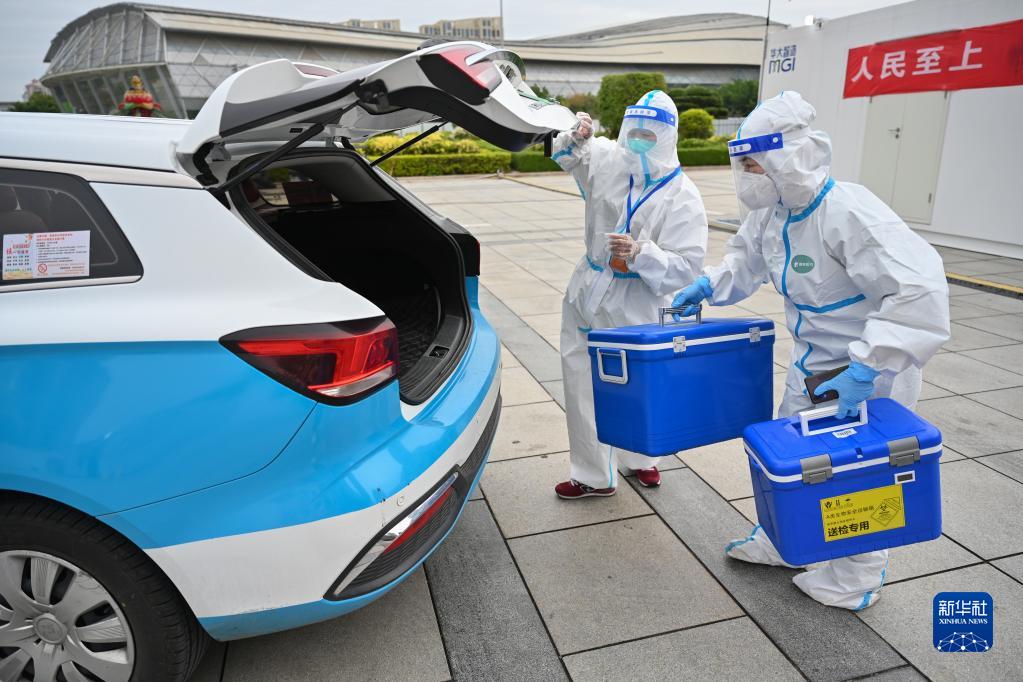 3月24日,在福建泉州市海峽體育中心聯合方艙核酸檢測基地,參加“抗疫志愿車隊”的出租車司機(左)協助醫務人員裝運核酸檢測樣本。新華社發(周義攝)
