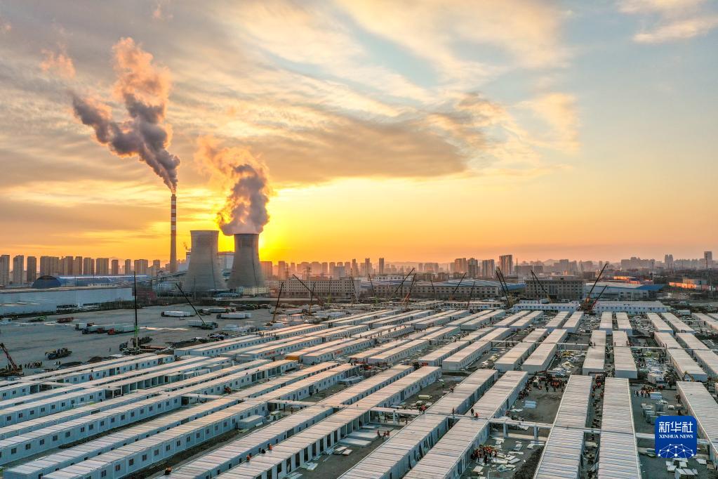 這是3月20日傍晚拍攝的吉林市高新南區隔離方艙建設現場(無人機照片)。新華社記者 張楠 攝