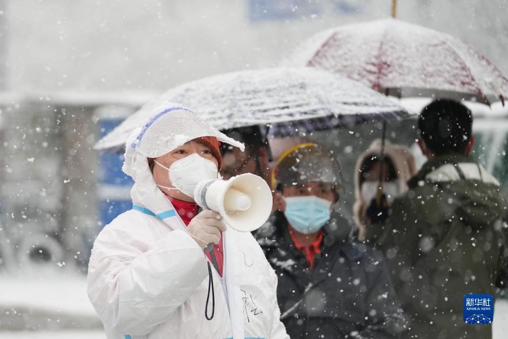 3月18日,在北京市東城區北新橋街道一處核酸采樣點,工作人員冒雪引導前來檢測的居民。新華社記者 鞠煥宗 攝