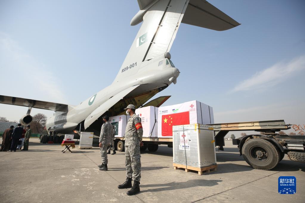 這是2021年2月1日在巴基斯坦首都伊斯蘭堡附近的努爾汗空軍基地拍攝的中國政府援助新冠疫苗交接儀式現場。新華社記者 劉天 攝