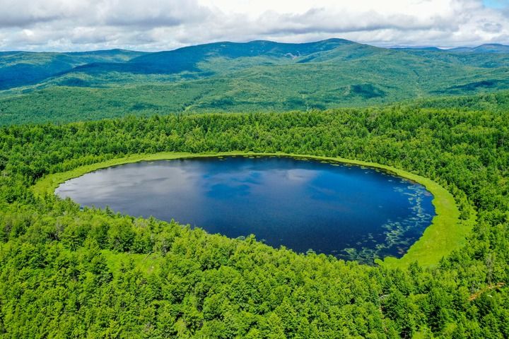 這是內蒙古阿爾山國家森林公園內的天池(2021年7月14日攝,無人機照片)。新華社記者 連振 攝