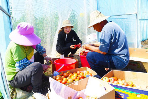 中國農業大學學生吳林靜和西槐莊村村民正在收獲番茄。黨維婷攝