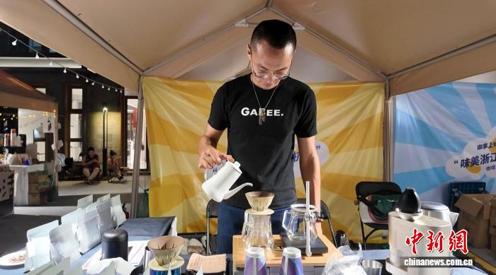 國慶假期,臺灣咖啡師李毅在浙江杭州的咖啡文化嘉年華上手沖咖啡。錢晨菲 攝