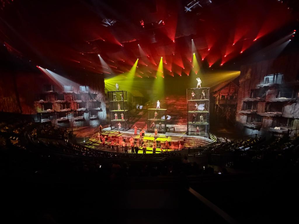 上一秒還是重慶熙攘的街頭巷陌,隨著舞臺和觀眾席的緩緩旋轉,場景無縫切換至渣滓洞監獄!皹屄暋睆亩下舆^,座椅隨“炮聲”震顫,燈光模擬出天邊破曉和熊熊火光……觀眾仿佛被拉回到1949年的山城。
