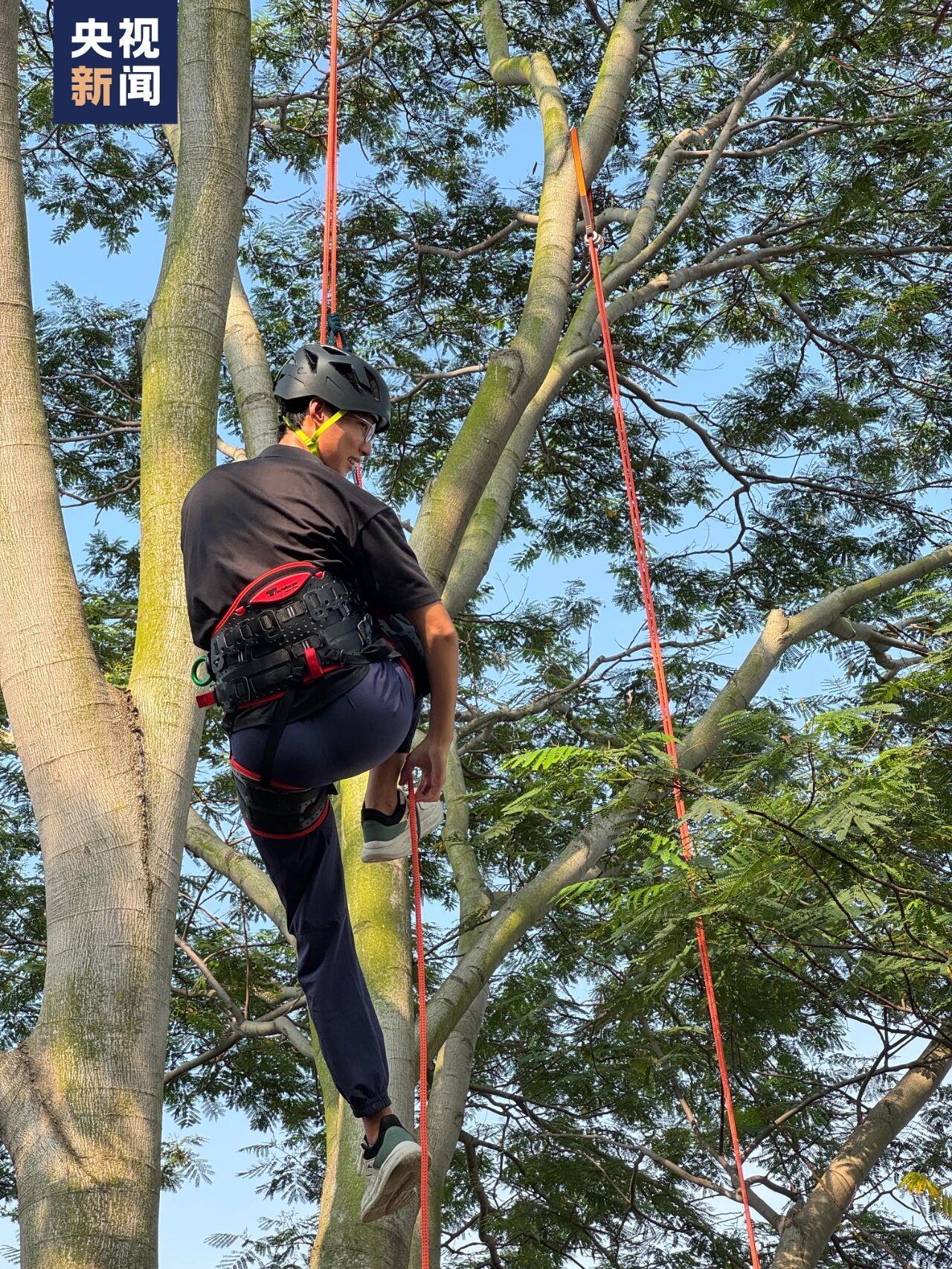 鄭達雄介紹:“攀樹師不僅要熟練使用各類攀樹裝備與器械,還需了解樹木養護、病蟲害防治等樹木學知識。同時,良好的運動能力和體力也是重要的職業素質!