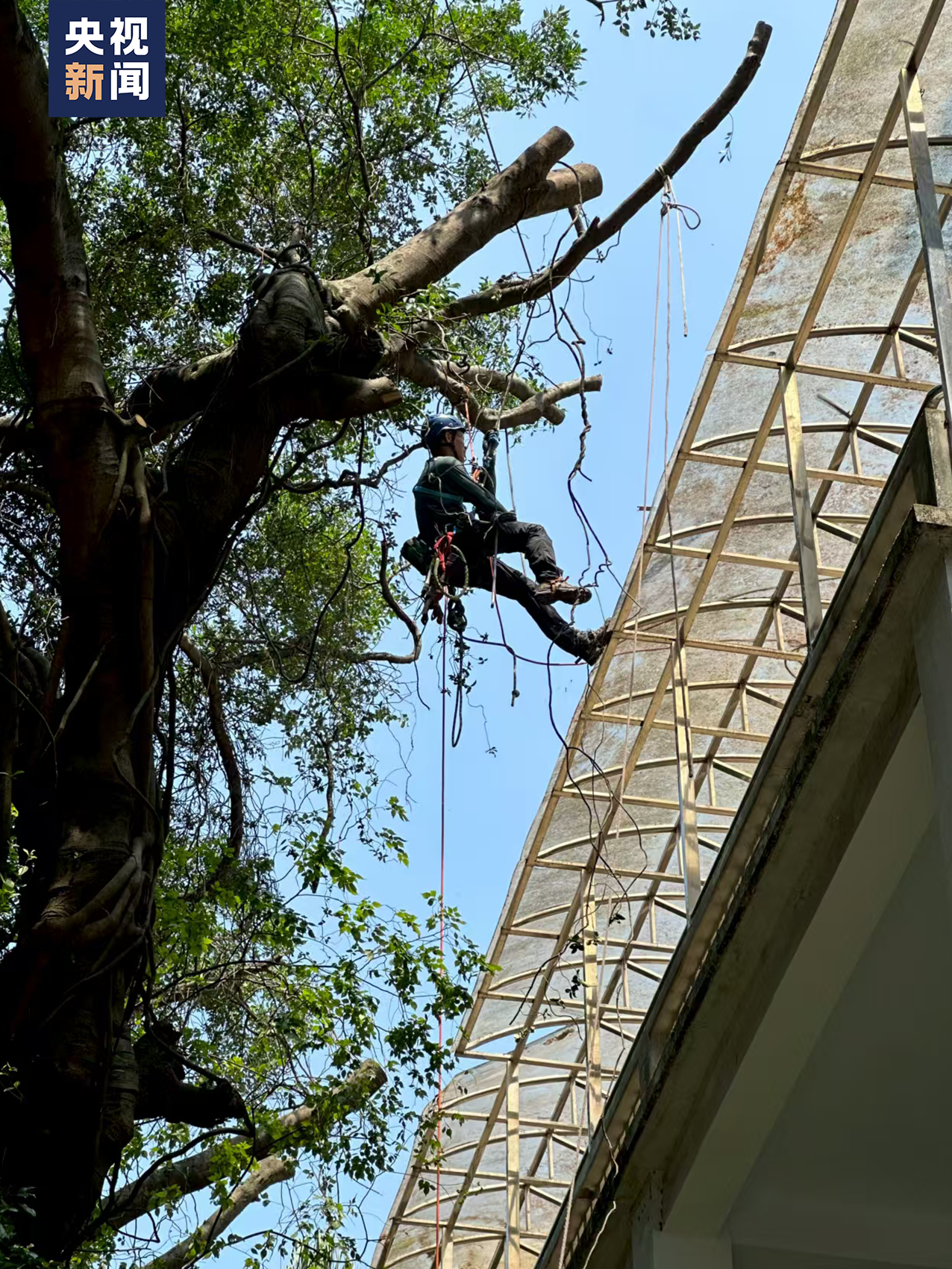 但常年生活在榕樹之下,遮天蔽日,導致周邊房屋潮濕發霉。這時,就需要攀樹師上樹修剪。