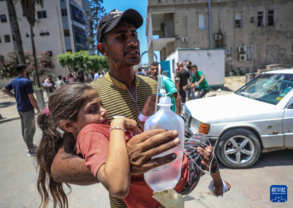 2025年7月13日,在加沙城一所醫院,一名男子懷抱在以軍空襲中受傷的女孩。新華社發(馬哈茂德·扎基攝)