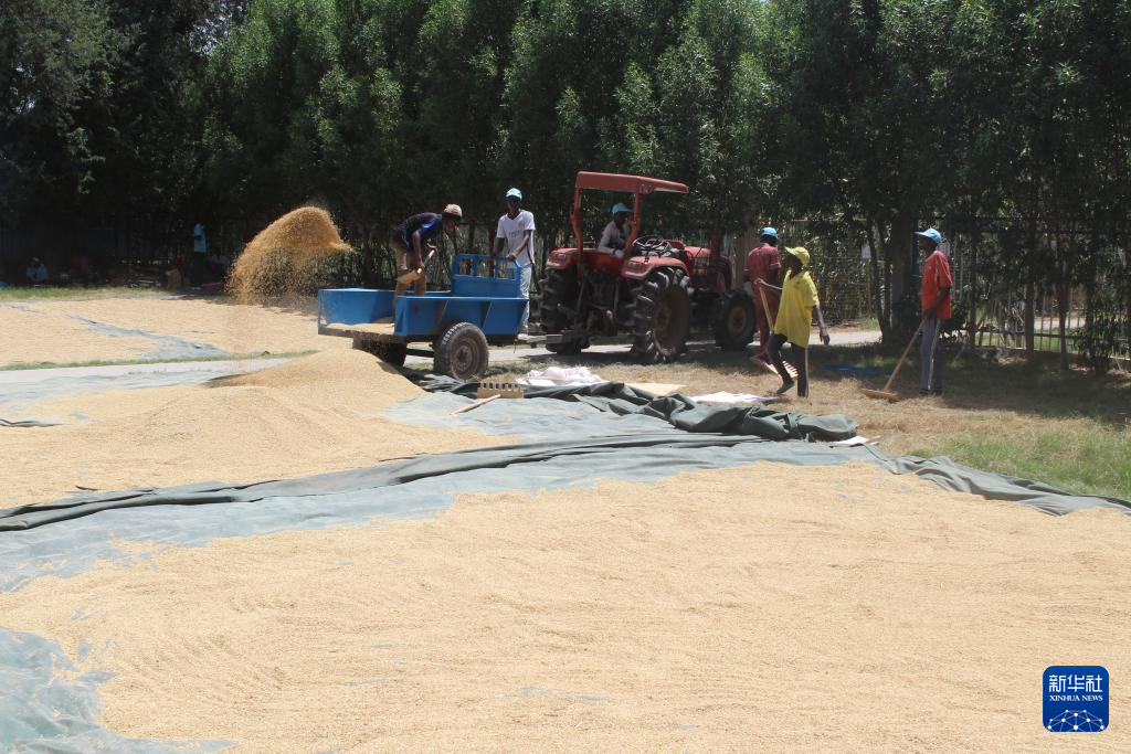 10月4日,在乍得哈杰爾-拉米斯省杜吉亞區米代金村的中國援乍得農業第八期技術援助項目基地,農民晾曬收割后的稻谷。新華社發(阿諾攝)
