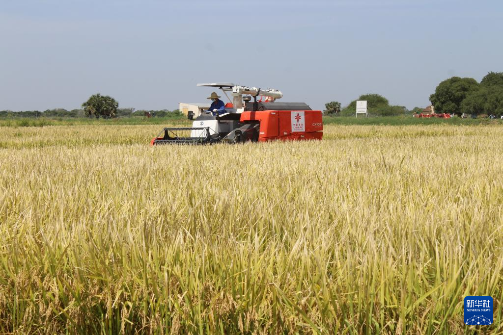 10月4日,在乍得哈杰爾-拉米斯省杜吉亞區米代金村,工作人員駕駛收割機收割水稻。新華社發(阿諾攝)