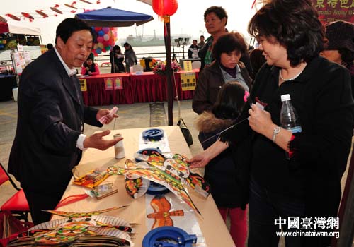臺灣民眾對北京風箏充滿興趣,現場向老師請教技巧(圖片來源:北京市臺辦)