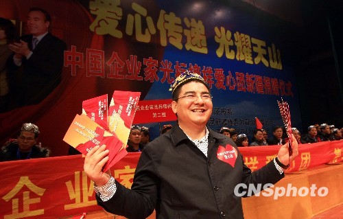 資料圖:2010年2月5日,被稱為“中國首善”的江蘇黃埔再生資源利用有限公司董事長陳光標,攜由46名愛心人士組成的中國企業家光標榜樣愛心企業團抵達新疆烏魯木齊,并在新疆財經學院為來自烏魯木齊、伊犁、石河子、和田、塔城、克拉瑪依等地的1000名貧困青少年發放紅包。中新社發 劉新 攝