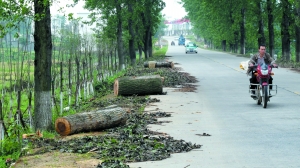 近日,在江西省湖口縣牛湖公路兩旁,不時可見被砍掉的大樹。據介紹砍掉大樹是為了推進該省“一大四小”綠化工程!耙淮蟆笔侵傅2010年全省森林覆蓋率達63%,“四小”是指縣城和市府所在地、鄉鎮政府所在地、農村自然村、基礎設施等區域改善綠化現狀。記者 陳寧一 攝