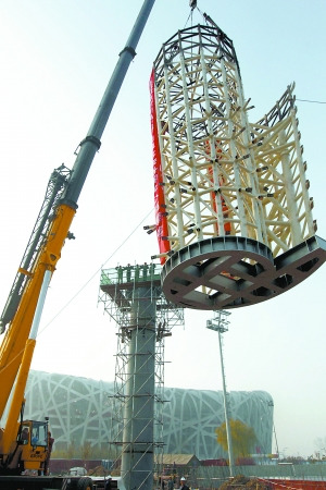 據介紹,北京奧運會后,火炬一直“臥倒”在鳥巢頂部。9月初,它被運往通州一家工廠“瘦身”。經過近兩個月的翻新、加固,奧運主火炬昨天上午在鳥巢北側熱身場旁開始吊裝。首先吊裝的是火炬頂部,一根16.8米高的鋼鐵脊柱早已扎根于火炬廣場,這是火炬的“芯”,吊車將火炬頂部送到脊柱上方,通過基座緊密相連。