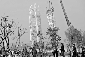 昨日,奧運主火炬在鳥巢北廣場進行吊裝,12米高的火炬主體在10分鐘內就被穩穩吊上16米高的基座。據了解,該項工程預計年底前完工,屆時鳥巢“空中走廊”工程也將啟動。鳥巢相關負責人透露,目前預計“空中走廊”建成后擬每次限流120人。記者 秦斌 攝