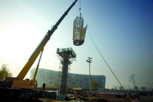 昨日,鳥巢奧運主火炬在鳥巢北廣場進行吊裝。記者 秦斌 攝