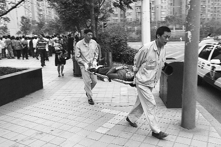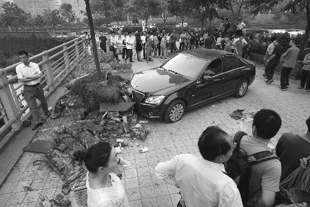 記者趕到現場時看到,一輛棗紅色的奔馳200轎車?吭谛轮衤仿房诘娜诵械郎,警方已在現場拉起警戒線,一名交巡警正在對現場進行勘察。轎車抵在一棵行道樹下的堡坎上,車頭已經嚴重變形,堡坎的一半已被撞垮,碎石塊散落一地。在轎車的左側車門邊,一攤鮮紅的血跡依然清晰可見。而路邊約1米高的花臺里的植物,順著人行道一側的方向倒下了一片。一名約20多歲的年輕女子在車邊不停地哭泣。這名身穿連衣裙、著平底鞋、長相漂亮的女子承認,奔馳車就是她駕駛的。