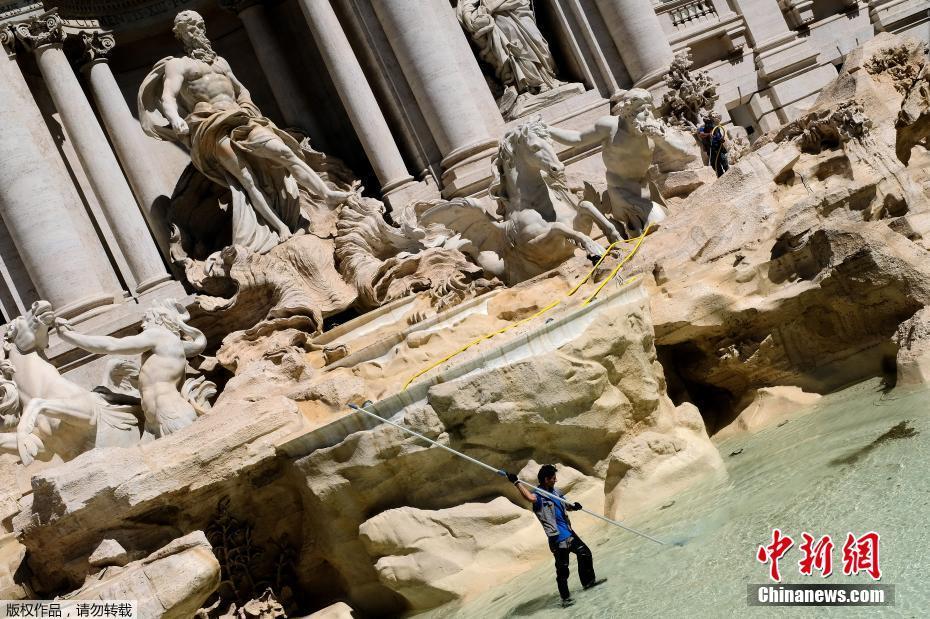 當地時間2017年5月2日,意大利羅馬,一名工人在特萊維噴泉里收集硬幣。每年從噴泉里收集到的硬幣大約價值100萬歐元。