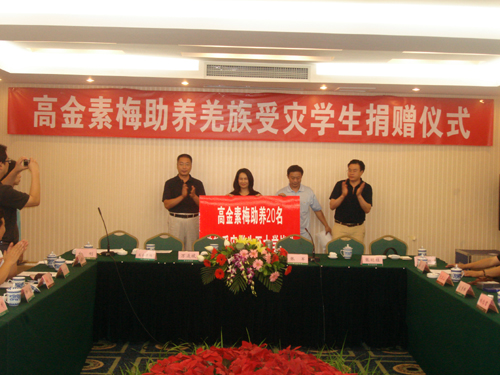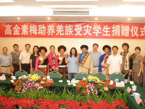 近日,高金素梅女士一行在四川省臺辦副主任張軍等人陪同下,奔赴綿陽北川,并于11日出席助養北川羌族學生捐贈儀式和教育重建座談會。四川省臺辦副主任張軍,綿陽市副市長萬連坡、黃正良,綿陽市臺辦、教育局及北川縣政府和相關部門負責人等參加會議。