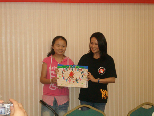 會上,受助學生代表張玉婷向高金素梅一行宣讀了感謝信。隨后,高金素梅女士與來自北川的20名受助羌族學生一一見面,并和學生家長進行交流。當了解到他們都失去了完整的家庭之后,高金素梅控制不住內心的傷痛,與學生家長們相擁痛哭,并鼓勵他們要面對地震災害的殘酷現實,樹立信心,重建美好家園。