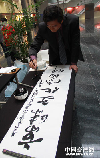 臺中書法家蘇仁彥用“京味文化傳兩岸 臺式風情兩岸馨”寄語京臺文化交流。(中國臺灣網 高斯斯 攝)